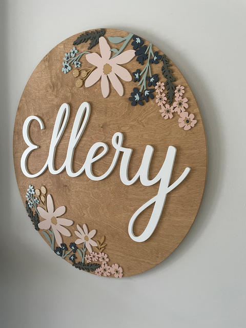 This layered Double Daisy name sign brings a gorgeous mix of florals and soft tones, perfect for adding warmth and personality to any nursery or child’s room. The hand-cut flowers and greenery fit together seamlessly, creating a sweet botanical arrangement that feels both playful and timeless. With your chosen name raised above the blooms, this piece becomes a sentimental keepsake that grows beautifully with your little one.