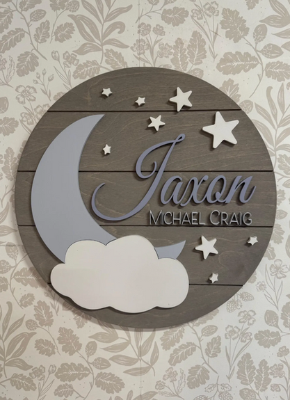 This dreamy moon, cloud, and stars name sign adds a soft, calming touch to any nursery. With gentle curves, layered celestial details, and your little one’s name beautifully centred, it creates a peaceful focal point perfect for storybook or celestial-themed spaces. Every element is hand-painted in your chosen colours, making each piece uniquely yours and a keepsake your family will treasure for years.