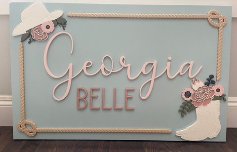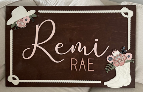 This western floral name sign blends sweet cowgirl charm with soft botanical details, making it a beautiful statement piece for nurseries, kids’ rooms, or even western-themed events. The engraved rope frame, cowgirl hat, boots, and layered florals create a lovely mix of texture and storytelling, while the raised personalized lettering adds a meaningful touch. Thoughtfully crafted and hand-painted, it’s designed to be both a keepsake now and a cherished heirloom for years to come.