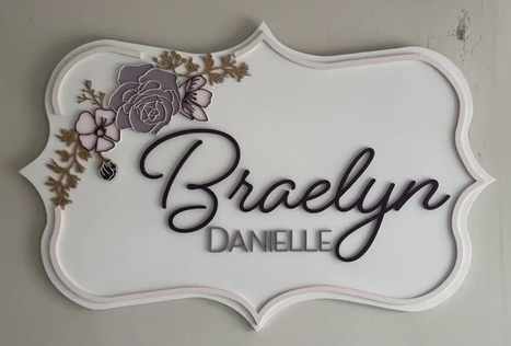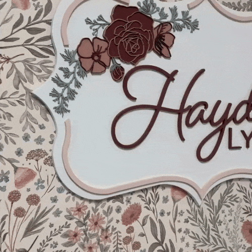This elegant arabesque-shaped name sign features soft, layered florals including roses, magnolias, and delicate foliage, all arranged on a beautifully contoured scalloped backboard. The raised lettering and floral details create a dimensional, timeless piece perfect for a baby girl’s nursery, a child’s bedroom, or even wedding décor. Feminine, refined, and thoughtfully crafted, it adds a standout touch to any floral-themed space.