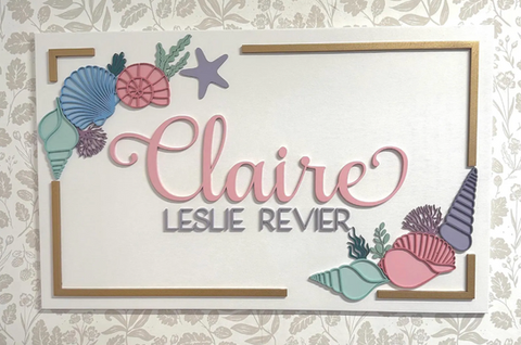This coastal-inspired rectangle name sign features layered seashells, coral, and ocean botanicals arranged around a clean framed border. With soft colours and raised details, it brings a serene, beachy feel to any nursery or child’s room. Perfect for ocean, mermaid, beach house, or seaside-themed décor, it also makes a beautiful and memorable baby shower gift.